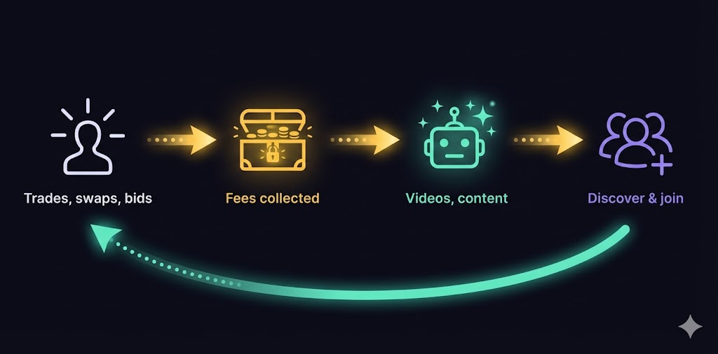 When treasury reaches deployment threshold, funds automatically route to LifeOrDream Studio. AI generates promotional videos, posts them to social platforms, and tracks performance — bringing new users who generate more fees. The cycle continues.