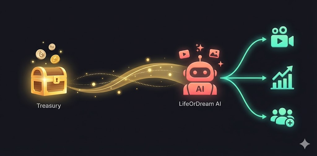 Treasury funds deploy to LifeOrDream Studio for AI-generated videos, marketing content, and new experiences — automatically.